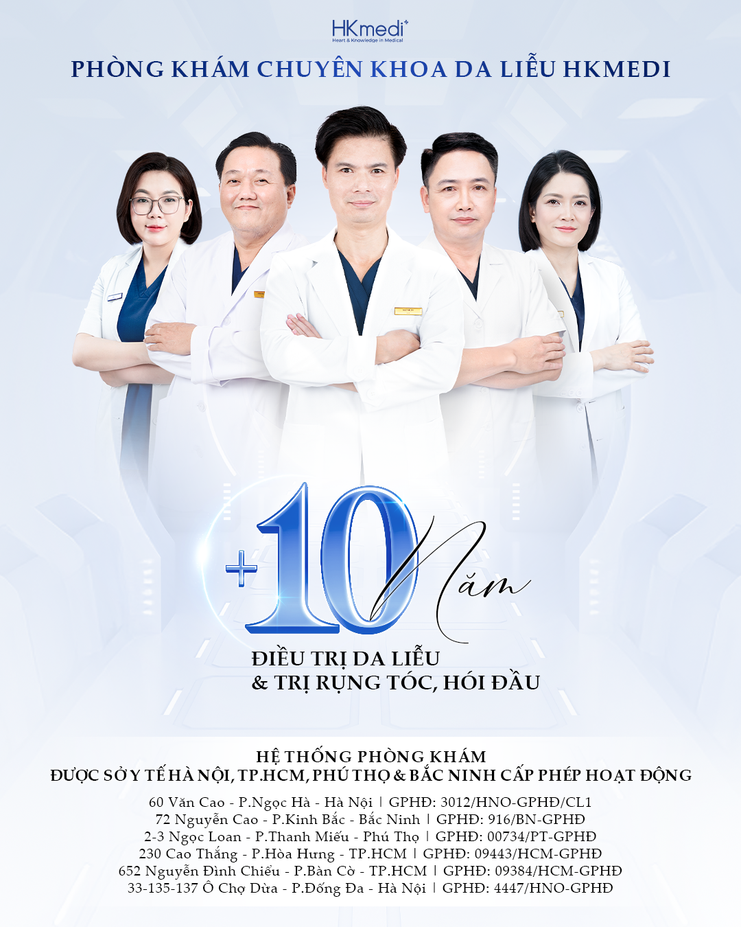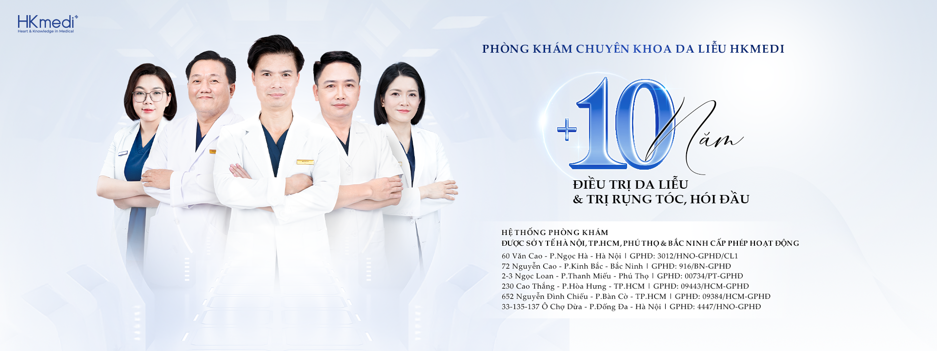 Đội ngũ bác sĩ tại HKmedi đều được đào tạo chính quy với đầy đủ bằng cấp, chứng chỉ hành nghề. Với hơn 10 năm kinh nghiệm, điều trị thành công cho hàng nghìn khách hàng trên toàn quốc. Bên cạnh đó, các bác sĩ không ngừng cập nhật phương pháp làm đẹp mới giúp khách hàng lấy lại làn da mịn màng, tự tin.