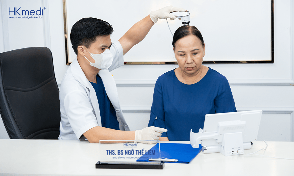 Tại Phòng khám chuyên khoa da liễu HKmedi, các bác sĩ sẽ tiến hành thăm khám lâm sàng, soi tóc và da đầu. Với các trường hợp cần điều trị, chúng tôi sẽ ứng dụng công nghệ điều trị rụng tóc và hói đầu tiên tiến mang đến nhiều lợi ích như: chăm sóc tóc, điều trị rụng tóc, tái tạo nang tóc và nuôi dưỡng tóc khỏe mạnh. Liệu pháp này ứng dụng các công nghệ hiện đại để cung cấp dưỡng chất trực tiếp cho nang tóc, kích thích tuần hoàn máu, thúc đẩy sản sinh collagen, từ đó hỗ trợ cân bằng nội tiết, giúp tóc mọc chắc khỏe và ngăn ngừa các vấn đề da đầu.