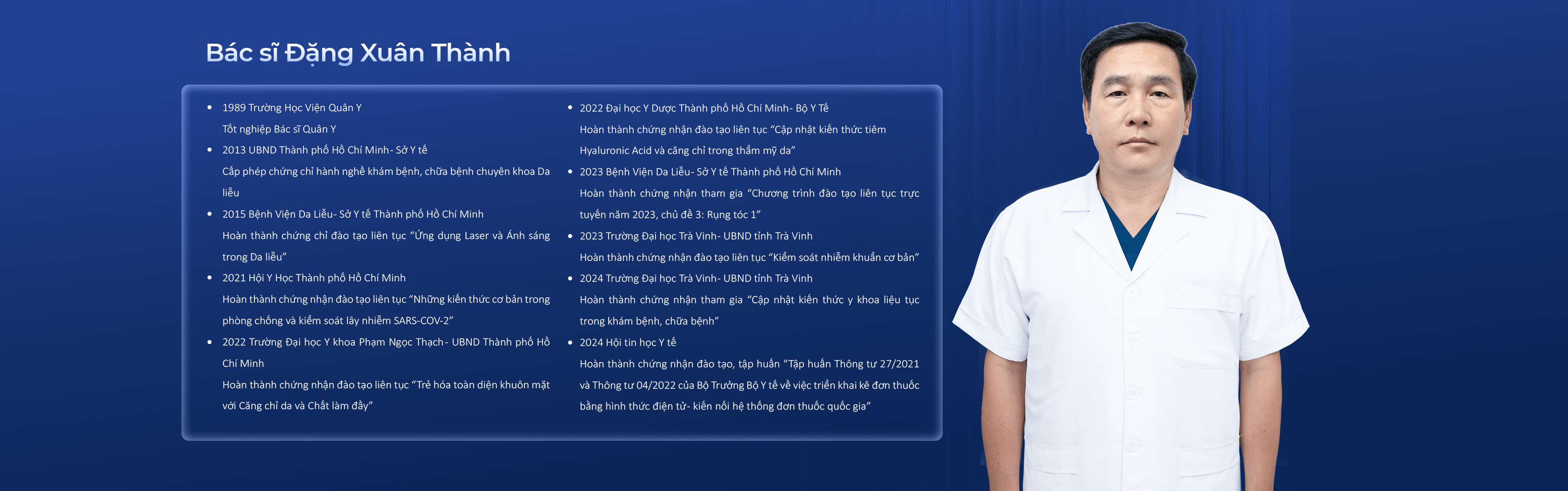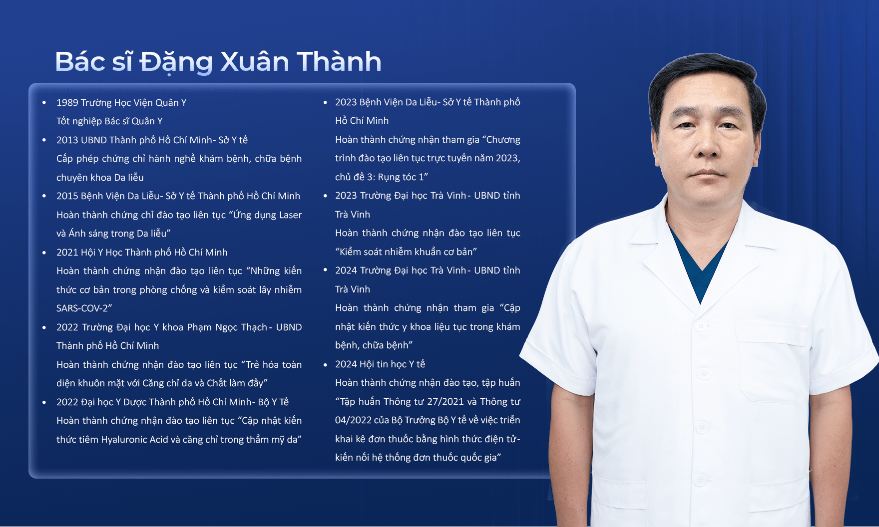 Với hơn 10 năm kinh nghiệm dày dặn trong lĩnh vực da liễu & thẩm mỹ, bác sĩ đã điều trị nhiều case khách hàng phức tạp gặp vấn đề rụng tóc, hói đầu, sẹo rỗ và nám da. Bằng việc ứng dụng các công nghệ tiên tiến như Laser Fractional CO2, Ultherapy và kỹ thuật tiêm Botox, Filler, bác sĩ Thành đã kiến tạo vẻ đẹp và sự tự tin cho hàng ngàn khách hàng khi tới với phòng khám HKmedi.