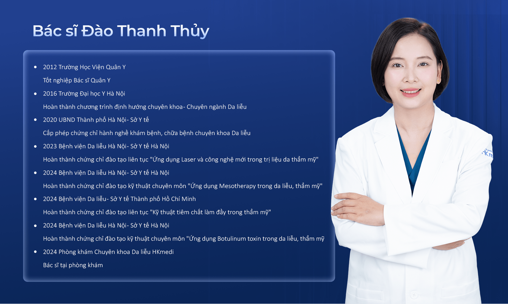 Bác sĩ Thủy có chuyên môn chẩn đoán và điều trị chuyên sâu các vấn đề da liễu như: sẹo rỗ lâu năm, mụn viêm, viêm da cơ địa, chàm, nấm da và các rối loạn sắc tố. Mục tiêu giúp phục hồi nền tảng da khỏe mạnh từ bên trong và xử lý các bệnh lý da liễu
