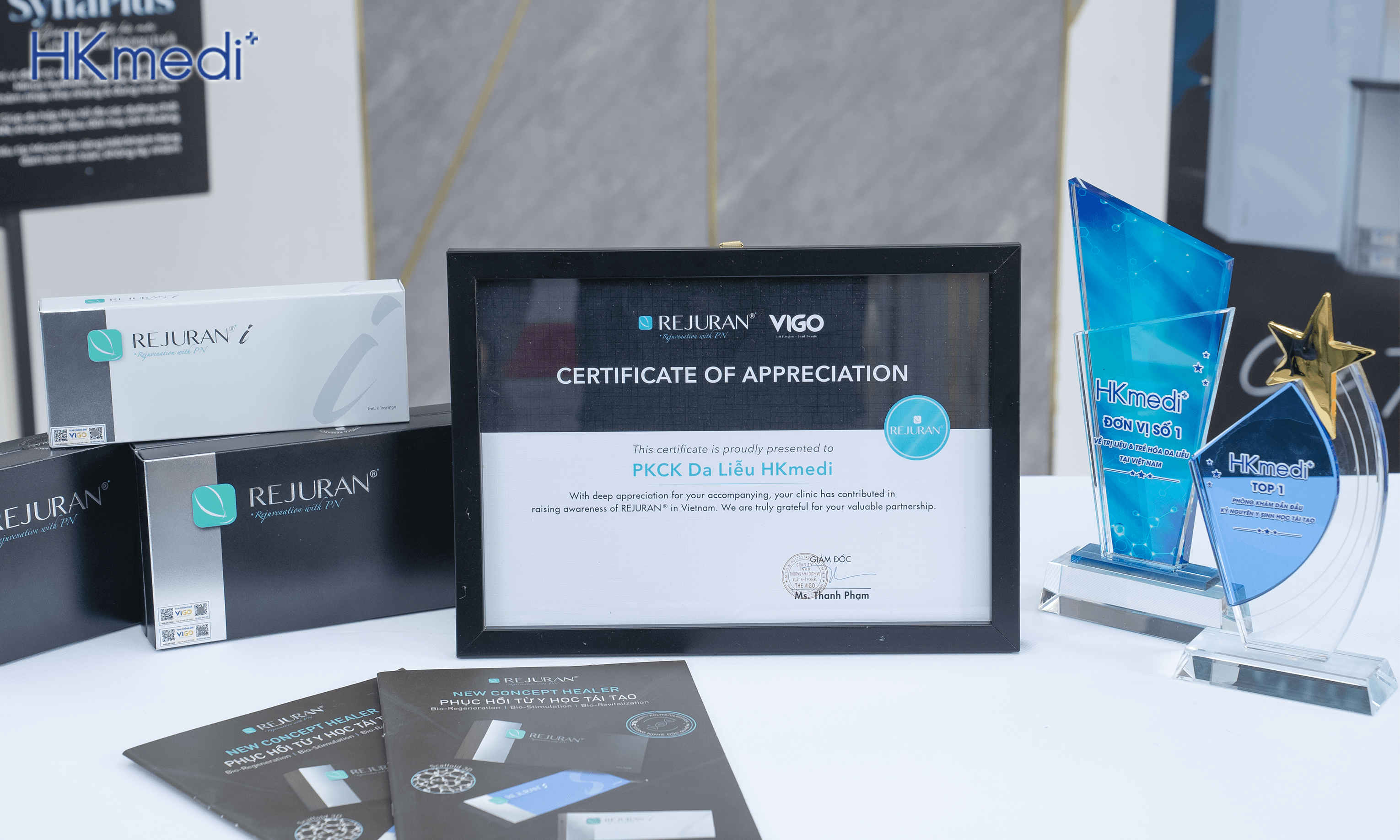 Được phân phối độc quyền bởi The Vigo, thương hiệu Rejuran® là một trong những giải pháp chăm sóc da hiện đại và hiệu quả nhất hiện nay. Giải thưởng lần này là minh chứng rõ nét cho những nỗ lực không ngừng nghỉ của HKmedi trong việc đưa các liệu pháp điều trị tiên tiến đến gần hơn với phụ nữ Việt. Không chỉ là niềm tự hào, giải thưởng còn khẳng định vị thế của HKmedi là đối tác chiến lược quan trọng của Rejuran® Vietnam, đồng hành trên hành trình kiến tạo vẻ đẹp toàn diện.
