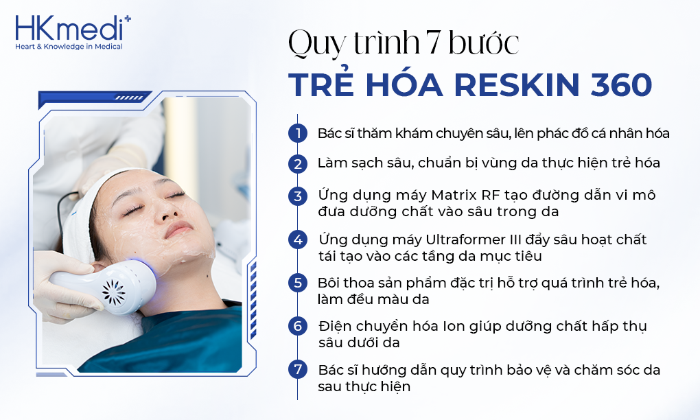 Tại HKmedi, sự an toàn của khách hàng luôn được ưu tiên. Quy trình Trẻ hóa Reskin 360 được thực hiện trong môi trường vô khuẩn với 7 bước chuẩn y khoa: