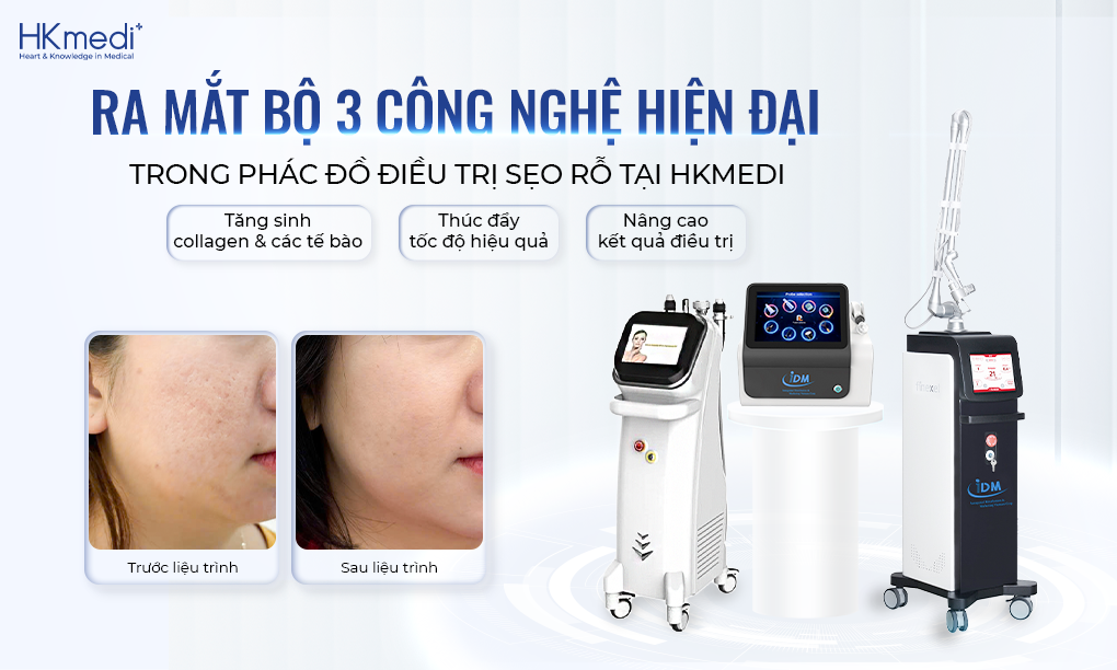 HKmedi đem đến giải pháp Điều trị sẹo rỗ thế hệ mới, kết hợp bộ 3 công nghệ tiên tiến giúp mang lại hiệu quả vượt trội: Tăng sinh collagen & elastin, rút ngắn thời gian điều trị, nâng cao hiệu quả cải thiện.