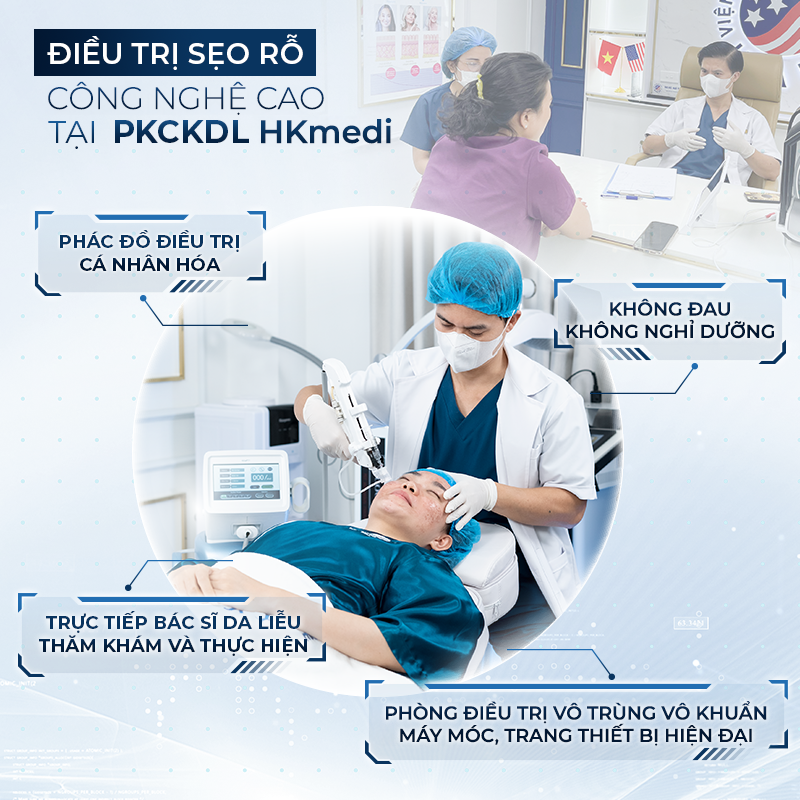 Sẹo rỗ lâu năm thường là biến chứng sau mụn trứng cá hoặc thủy đậu, gây ảnh hưởng đến tính thẩm mỹ. Bất cứ ai bị sẹo rỗ đều mong muốn sở hữu 1 làn da sạch sẹo láng mịn. Sau gần 10 năm điều trị cho hàng ngàn khách hàng, Phòng khám Chuyên khoa Da liễu HKmedi tự hào với công nghệ điều trị sẹo rỗ thế hệ mới – phương pháp thẩm mỹ tiên tiến được đội ngũ bác sĩ nghiên cứu và phát triển trong nhiều năm. Cùng tìm hiểu thông tin chi tiết tại bài viết này nhé!